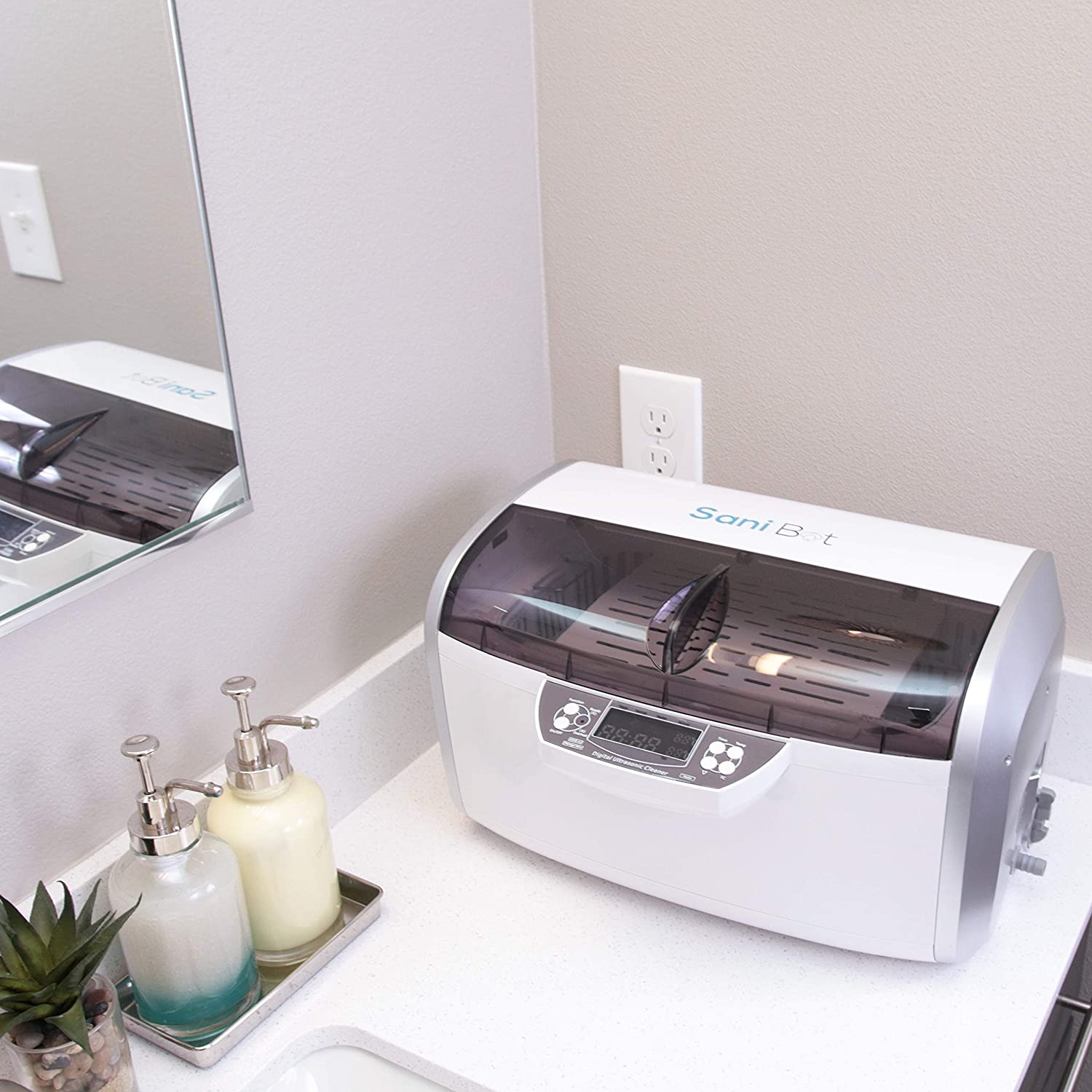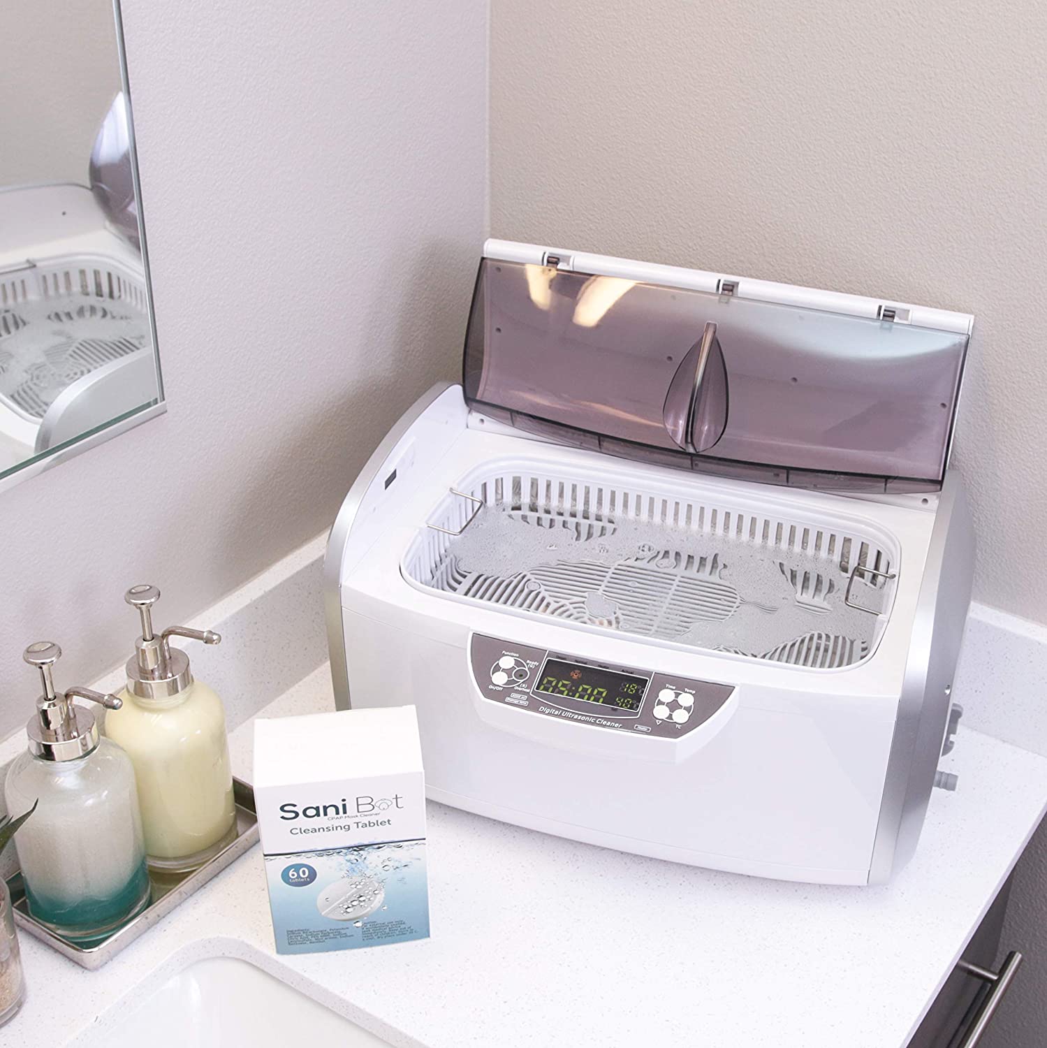 - MAINTAIN PROFESSIONAL CLEANING AT HOME: Sani Bot’s Patented CPAP apparatus cleaner utilizes the cleansing power of ultrasound, water and powerful SaniTabs tablets (60 day supply included) to deliver heavy duty cleaning within the comfort of your own home. It removes dirt, debris, oils and other organic residue, fast and effortlessly, without leaving any unpleasant odors. Newly equipped with handy drain and hose for convenient disposal of grey water